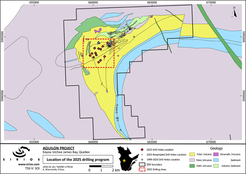 Montréal (Québec) – Sirios Resources Inc. (TSX-V: SOI) reports assay results from an additional sampling program performed on 1,496 metres of drill core from its Aquilon gold project in the Eeyou Istchee Baie-James region of Québec. Results from six drill holes that were continuously sampled along their entire core length further define a gold-bearing halo that was discovered in 2025. The halo extends laterally for more than 700 metres from south to north and over a width of 300 metres dipping eastward, according to the geological and structural interpretation of the area.